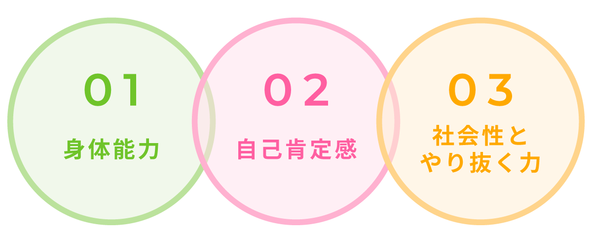 基本的な運動能力はもちろん、自分の体を思い通りに動かす力やバランス感覚など、すべてのスポーツに通じる「身体の土台」をしっかり育てます。